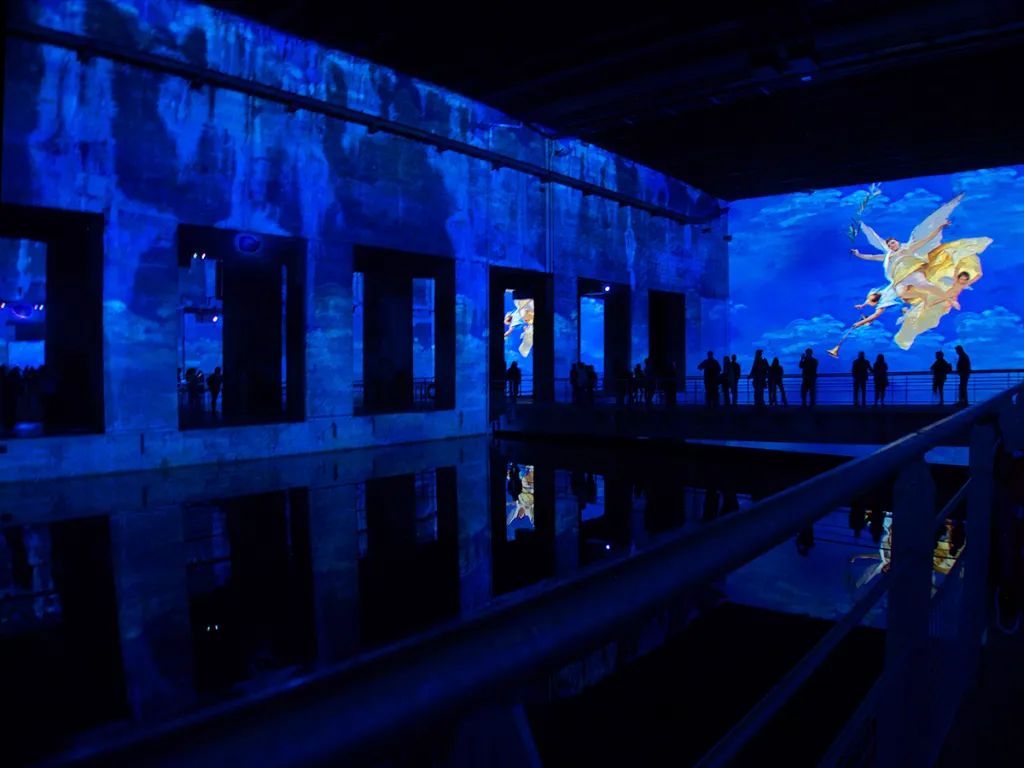 Bassins des Lumières位于法國波爾多一個前二戰(zhàn)潛艇基地內(nèi),以將這座被炸毀的建筑改造成當(dāng)?shù)馗挥惺⒚奈幕包c(diǎn)。擁有超過13000平方米的投影面積,數(shù)字投影不僅與潛艇基地的建筑完美契合,并在四個巨大的水面投下倒影,為沉浸式體驗(yàn)增添了新的維度。