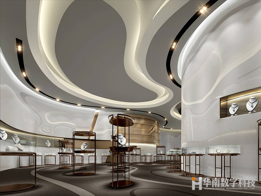 深圳羅湖珠寶展示中心總面積約1000平米,造價約一千萬。是海內(nèi)公認(rèn)的珠寶首飾制造生產(chǎn)中心和交易中心,本案的珠寶展示展廳設(shè)計靈感來源于寶石的形態(tài)以及女性的柔美,韻律流暢的線條為展示展廳賦予了時尚的格調(diào),同時以不同的質(zhì)感純凈的白為空間底色,煙粉明黃,藍(lán)色等點綴其中,打造夢幻輕奢的氣質(zhì)。華南數(shù)字科技在設(shè)計展示展廳本項目時,更能從消費者角度出發(fā),用消費者的眼光以設(shè)計之手法傳遞共情。